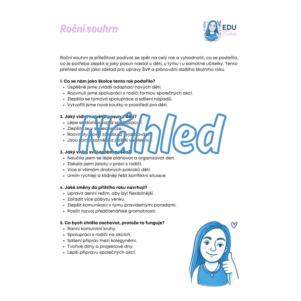 ✨ Získejte jasnější přehled o své práci, radost z dosažených výsledků a inspiraci pro další školní rok. Tento materiál vám vše zpřehlední a ulehčí.