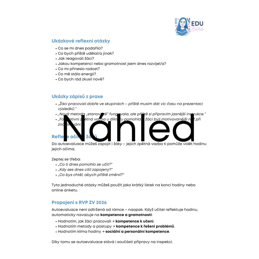 ukázky metod a nástrojů (dotazníky, hospitace, checklisty, reflexe),