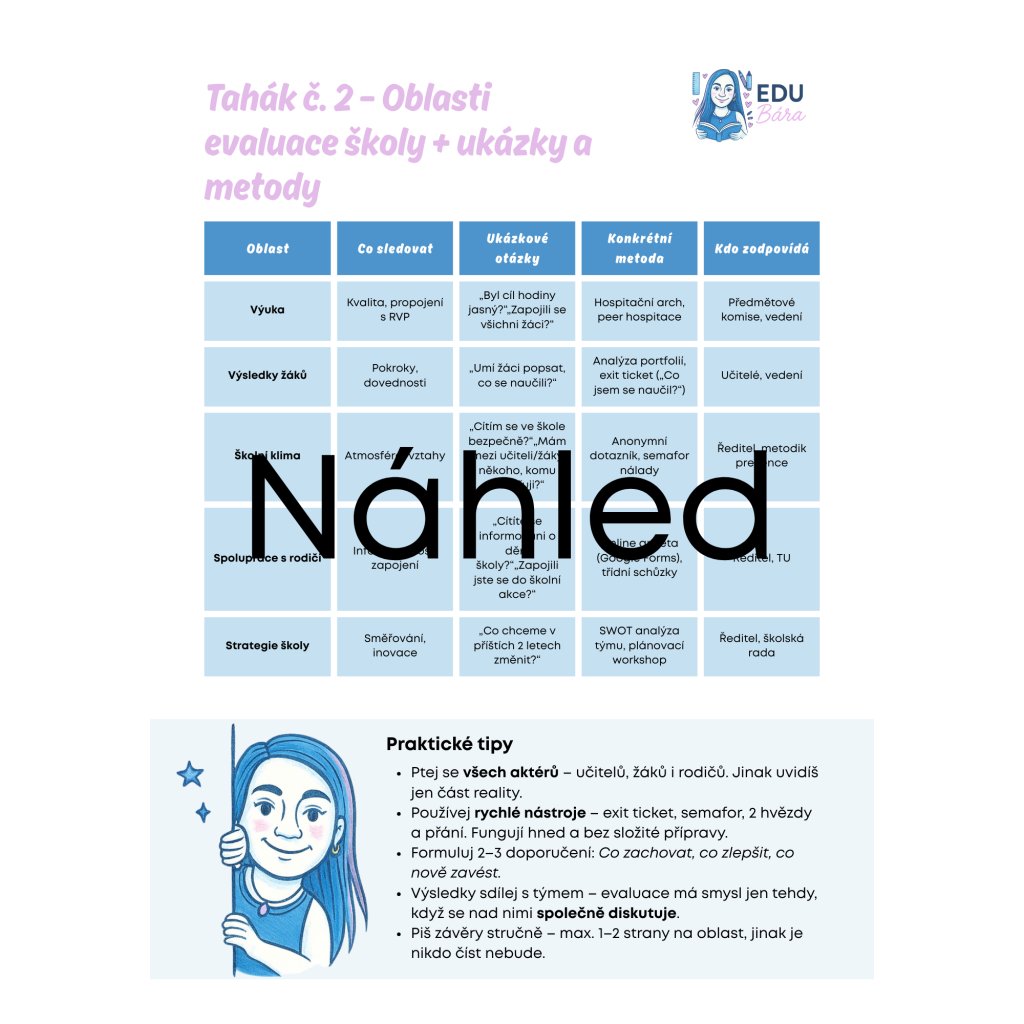 👉 Evaluace není hledání chyb. Je to zrcadlo, které ti ukáže silné stránky i oblasti pro zlepšení. Díky tomu získáš zpětnou vazbu, která má smysl pro žáky, učitele i vedení školy.