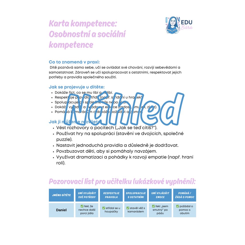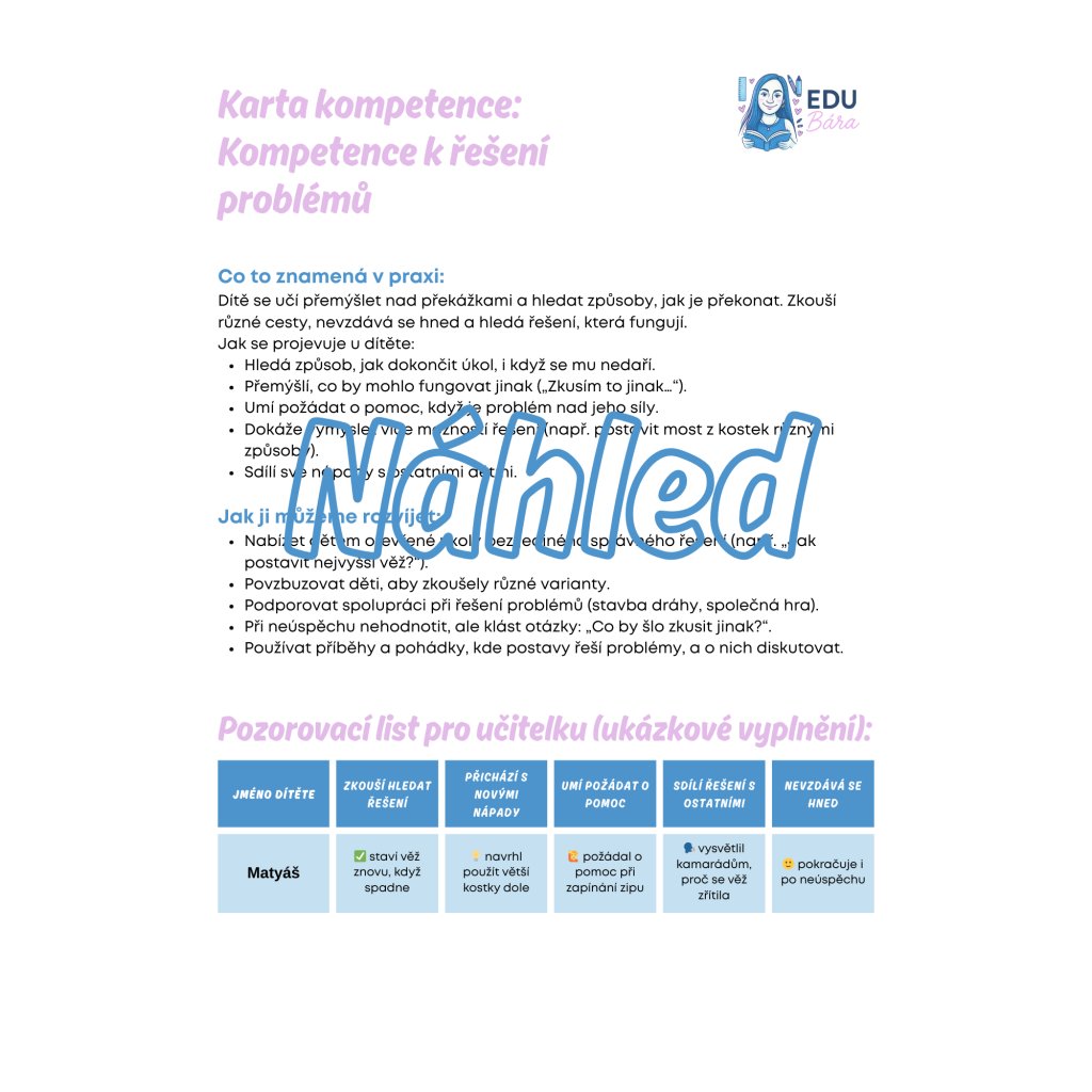 Každá karta obsahuje jednoduchý popis, jak se kompetence projevuje v praxi, tipy na činnosti pro její rozvoj a tabulku pro pozorování dětí.