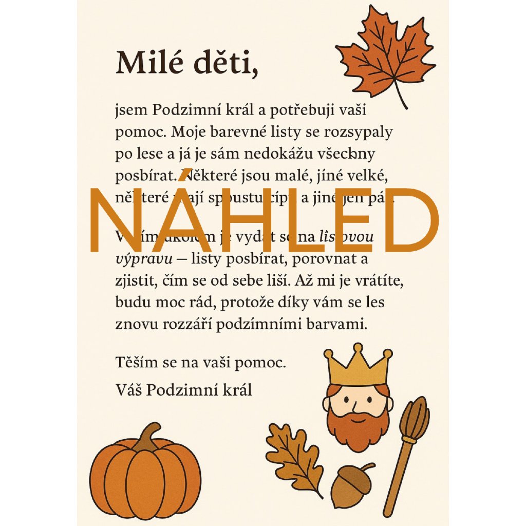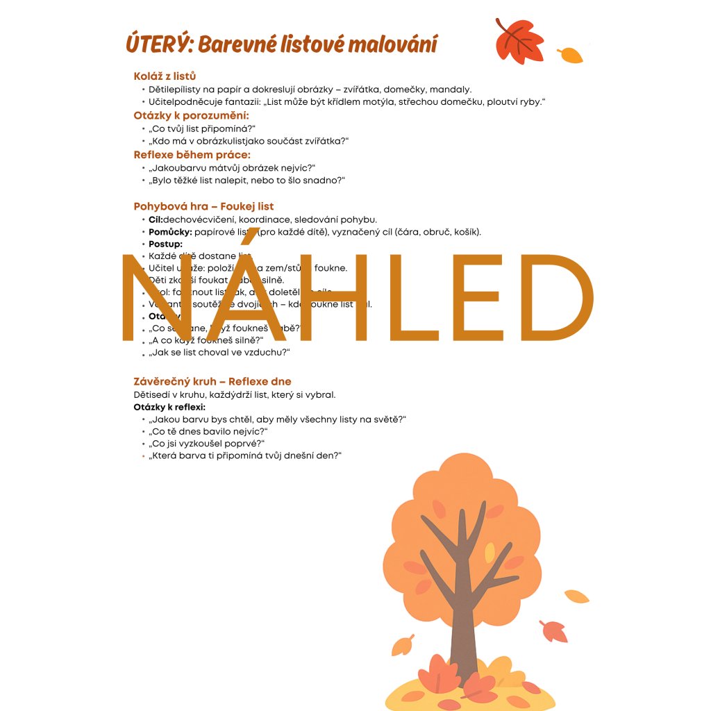 Objevte s dětmi kouzelný podzim plný barev! Sada Listové kouzlení nabízí hry, pohádky, tvoření i badatelské aktivity na celý týden. Vše připraveno krok za krokem – ušetří vám čas a dětem přinese radostné zážitky.