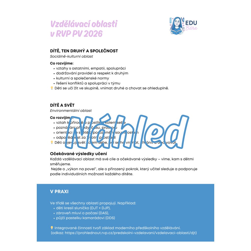 ✨ Balíček ŠVP + RVP je ideální pro učitelky i vedení MŠ, které chtějí mít jasno v novém RVP a umět ho jednoduše přenést do svého ŠVP i každodenní práce s dětmi.
