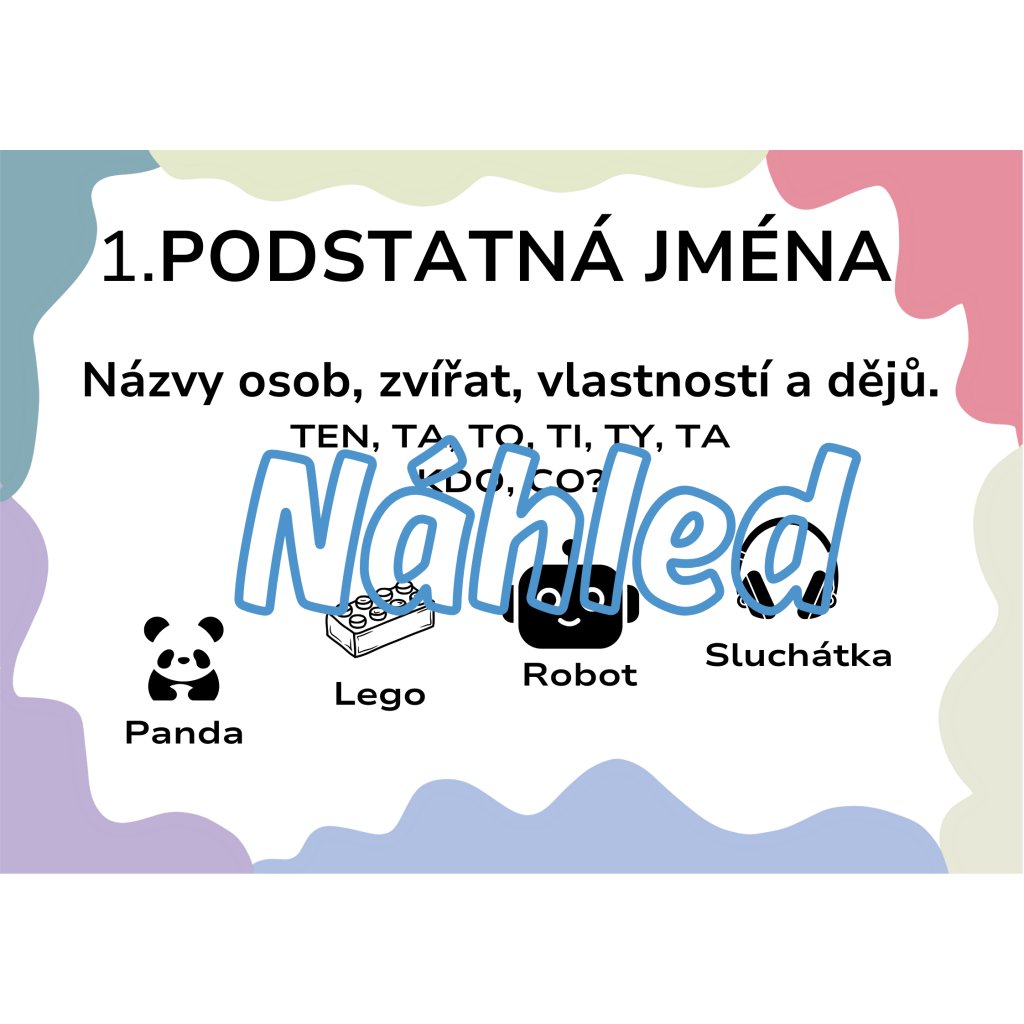 Barevné přehledové karty, které dětem usnadní pochopení podstatných jmen, pádů i slovních druhů.