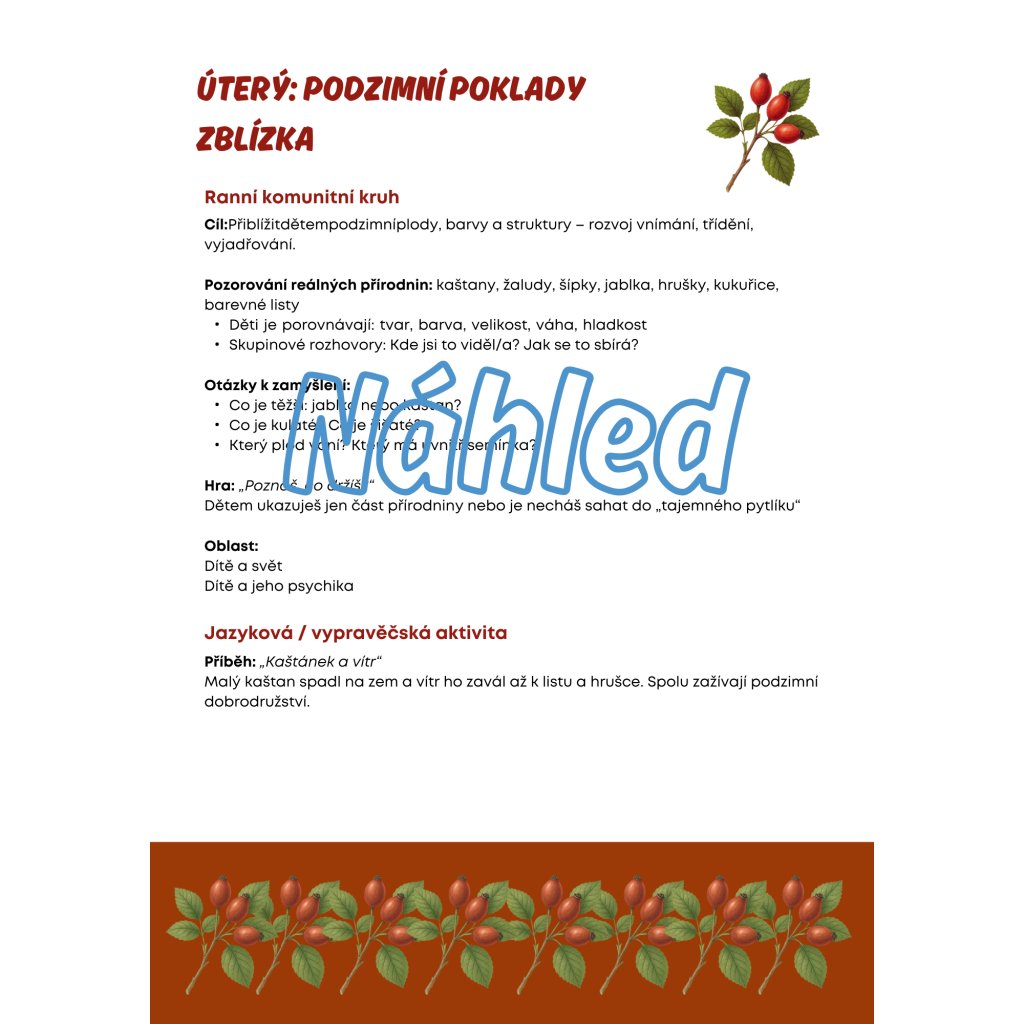 Plánování podzimních aktivit bývá časově náročné. Tento balíček ti nabídne hotový program na celý týden – od pondělí do pátku – v souladu s RVP PV 2026. Najdeš v něm pohádky, smyslové hry, pracovní listy i nápady na slavnostní zakončení týdne.
