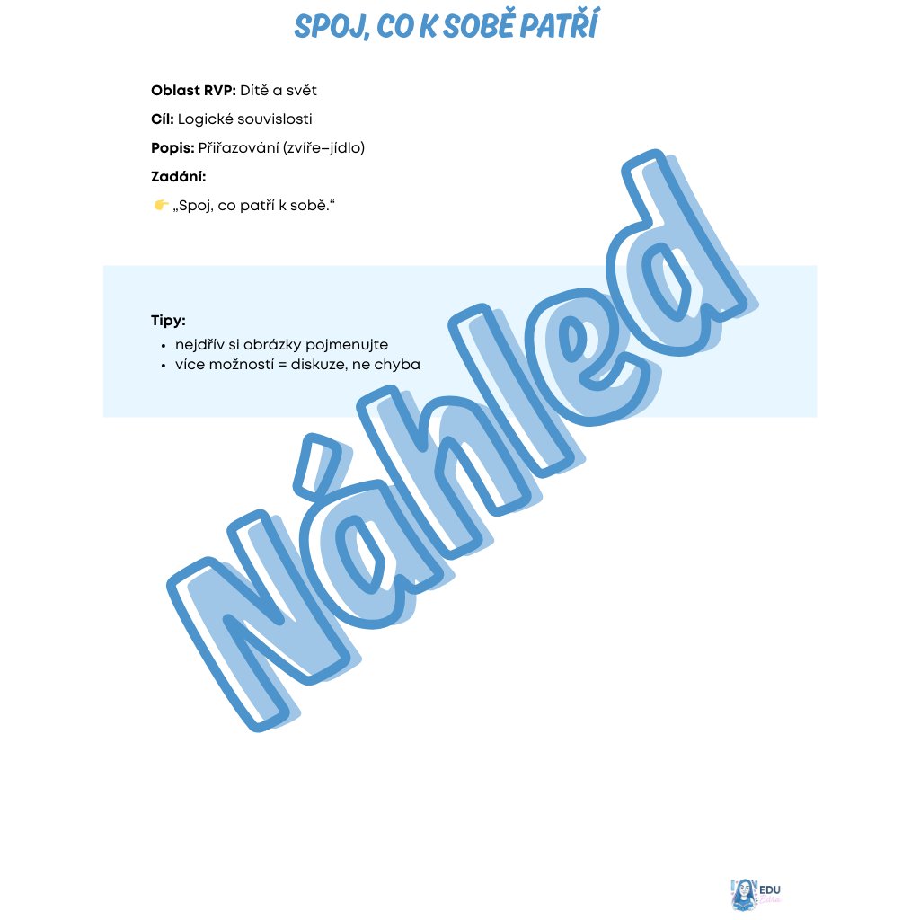 Pracovní listy pro děti MŠ (4–5 let) obsahují 15 aktivit, které můžeš využít samostatně, postupně nebo jako součást běžného dne ve třídě. Každý list má jasný cíl, jednoduché zadání a tipy, jak s dětmi pracovat bez tlaku na výkon.