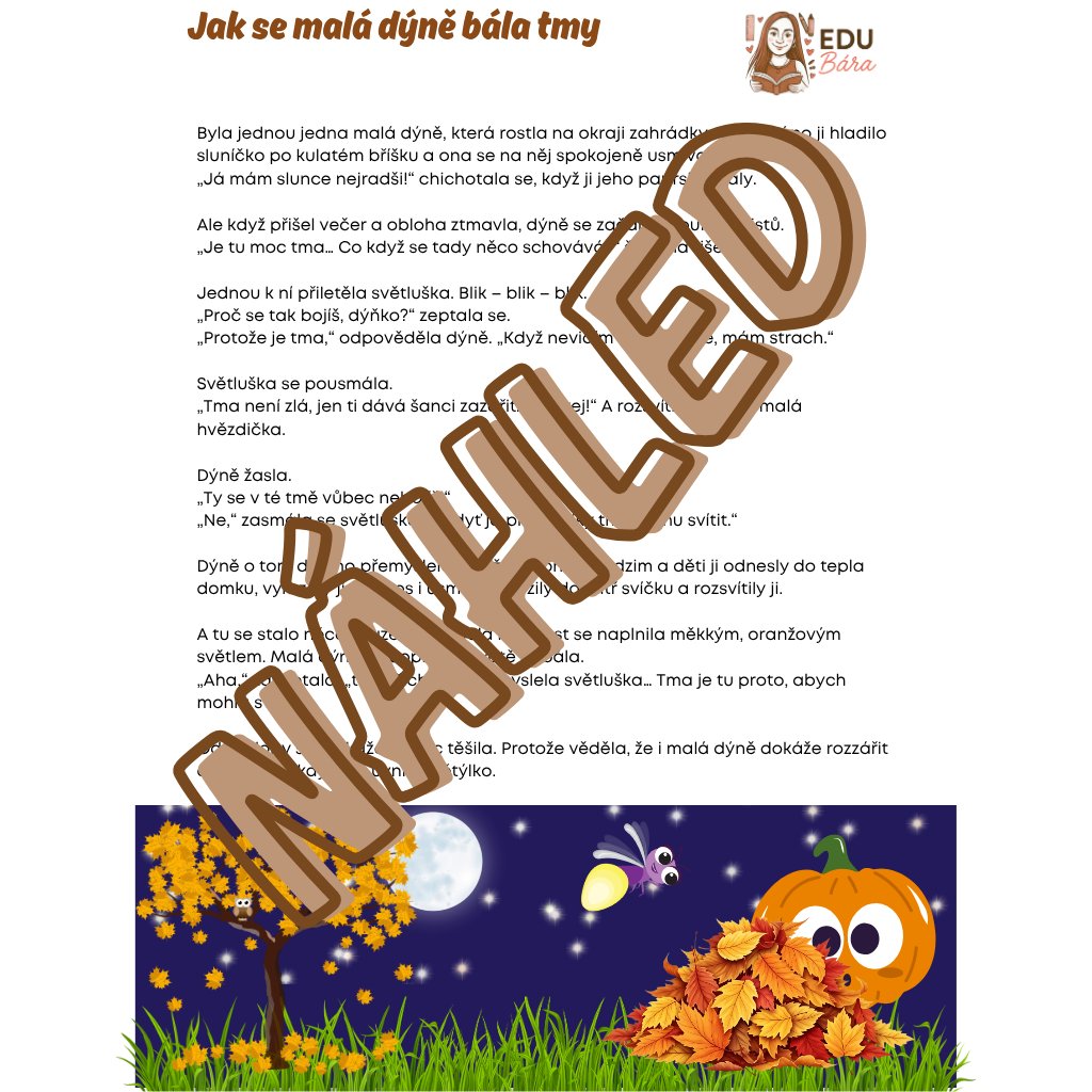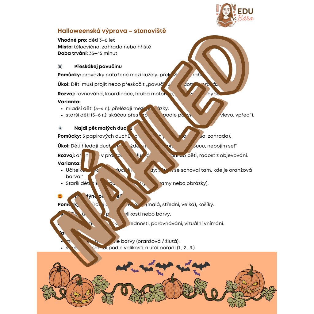 Tematický týdenní balíček Tajemství halloweenského lesa provede děti světem dýní, světýlek a přátelských duchů. Najdete v něm příběhy, smyslové aktivity, výtvarné a pohybové hry i pracovní listy podle RVP PV 2026. Ideální pro MŠ i domácí tvoření — bez strašení, jen s radostí, odvahou a fantazií! 🎃