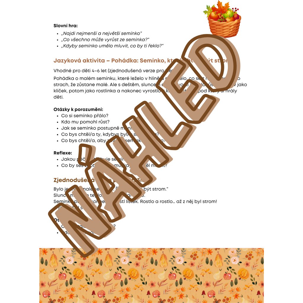 🍂 Tajemství podzimní zahrady je eBook, který promění vaši školku v kouzelné místo objevů. Děti se vydají s pohádkami a aktivitami do zahrady plné skrytých pokladů – pod listím, v hlíně i mezi přírodninami.
