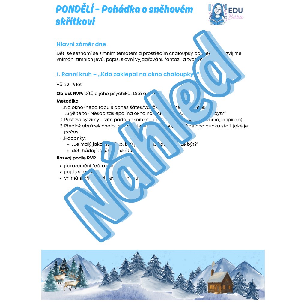 Tento bohatý e-book přináší 5 tematických dnů plných pohádek, her, tvoření, smyslových aktivit, pokusů, pracovních listů a pohybových her – vše podle RVP PV 2026. Ideální pro zimní tematický týden, advent i období, kdy chcete dětem přinést pohodu, fantazii a společné prožívání.