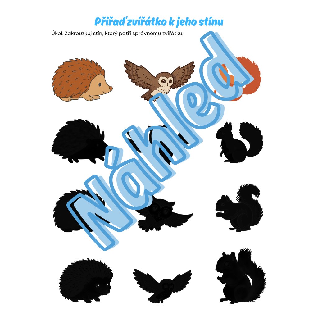 Pracovní listy: stínová hra, „Co jí zvířátko?“, dokresli, vybarvi chaloupku (str. 38–41).