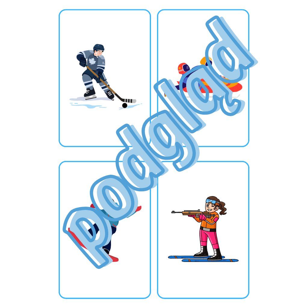 Karty obrazkowe ze sportami zimowymi, sprzętem sportowym i symbolami olimpijskymi.
